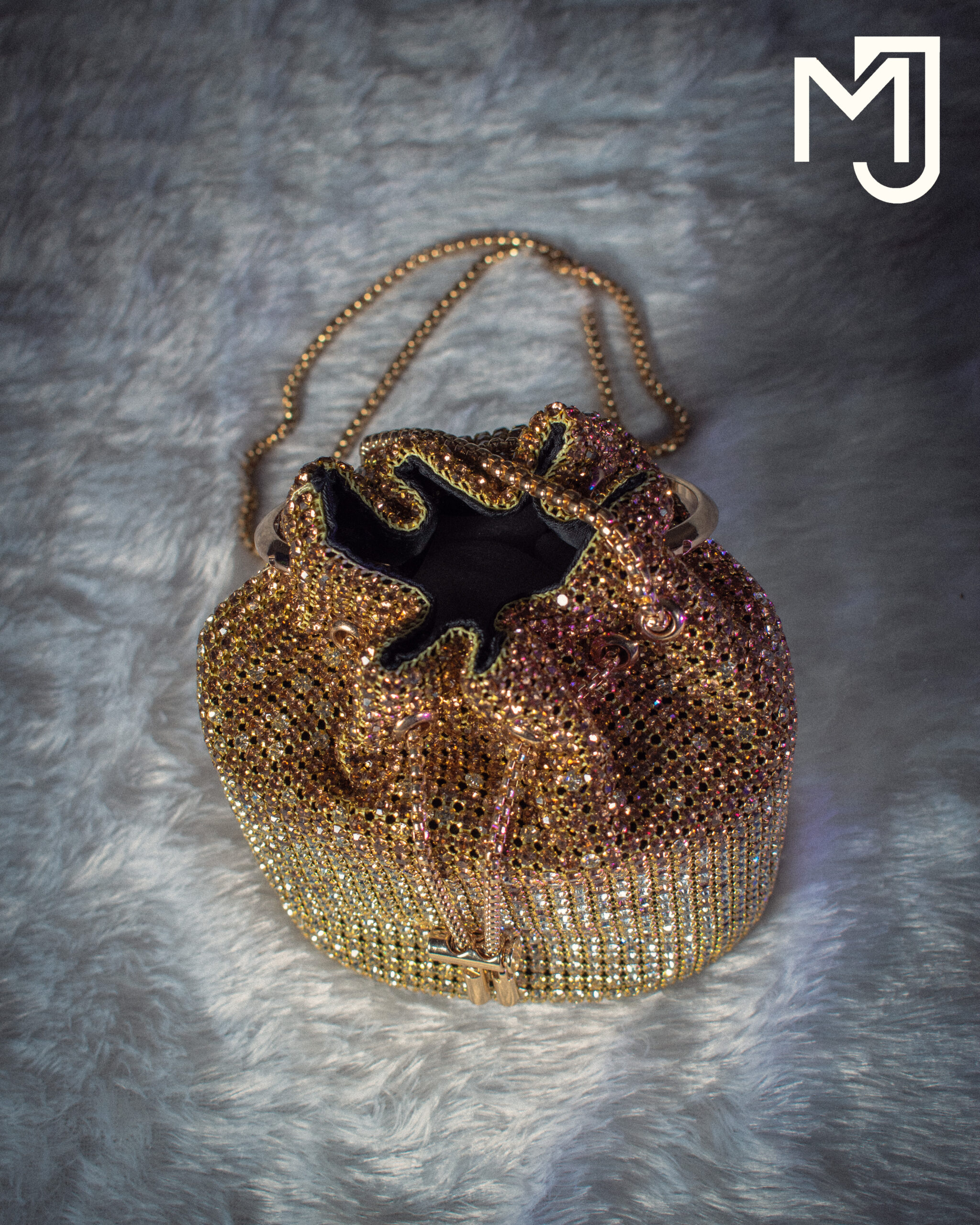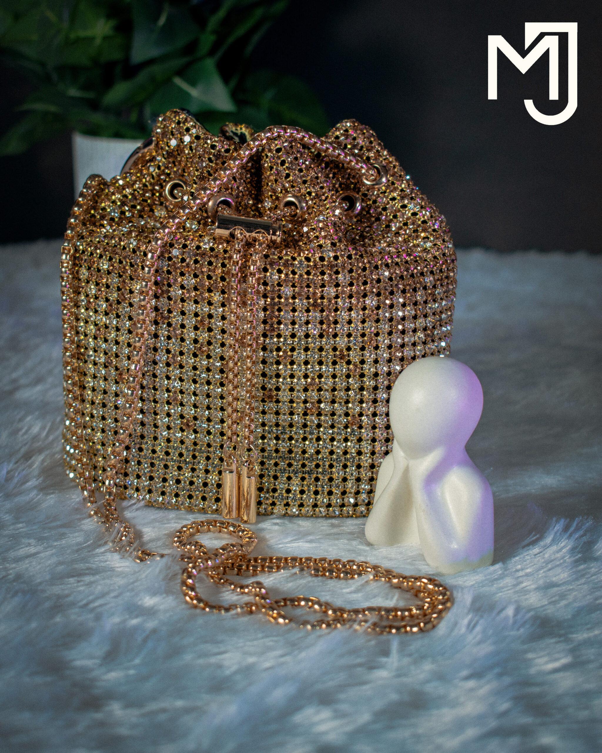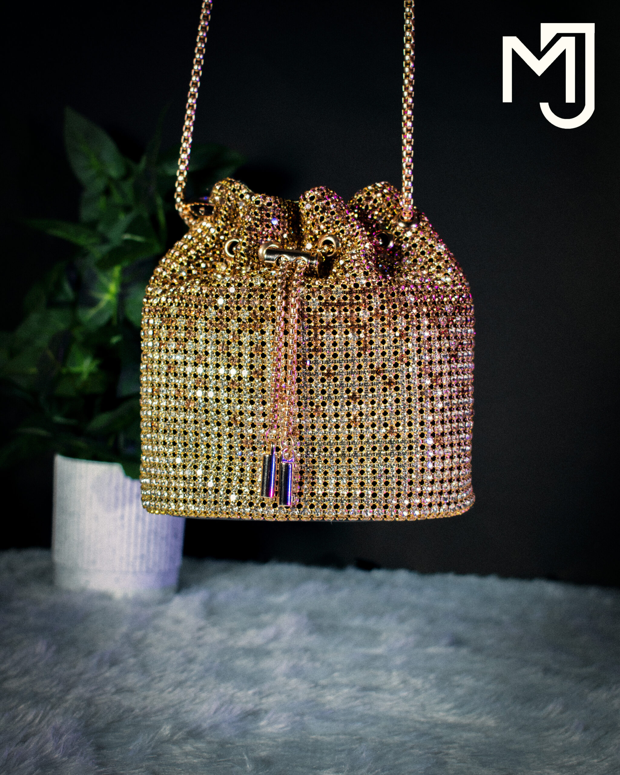 Luxury Gold Crystal Bucket Bag for Women | Party & Wedding Clutch with Chain Strap